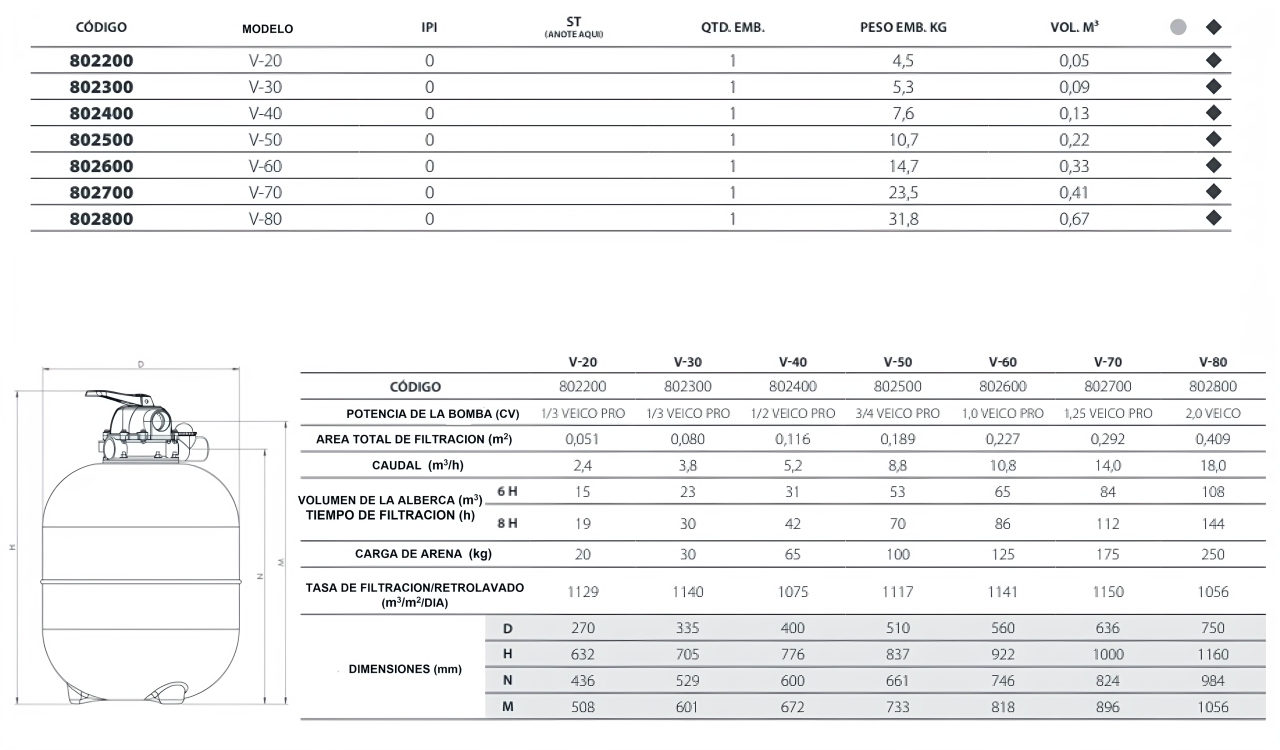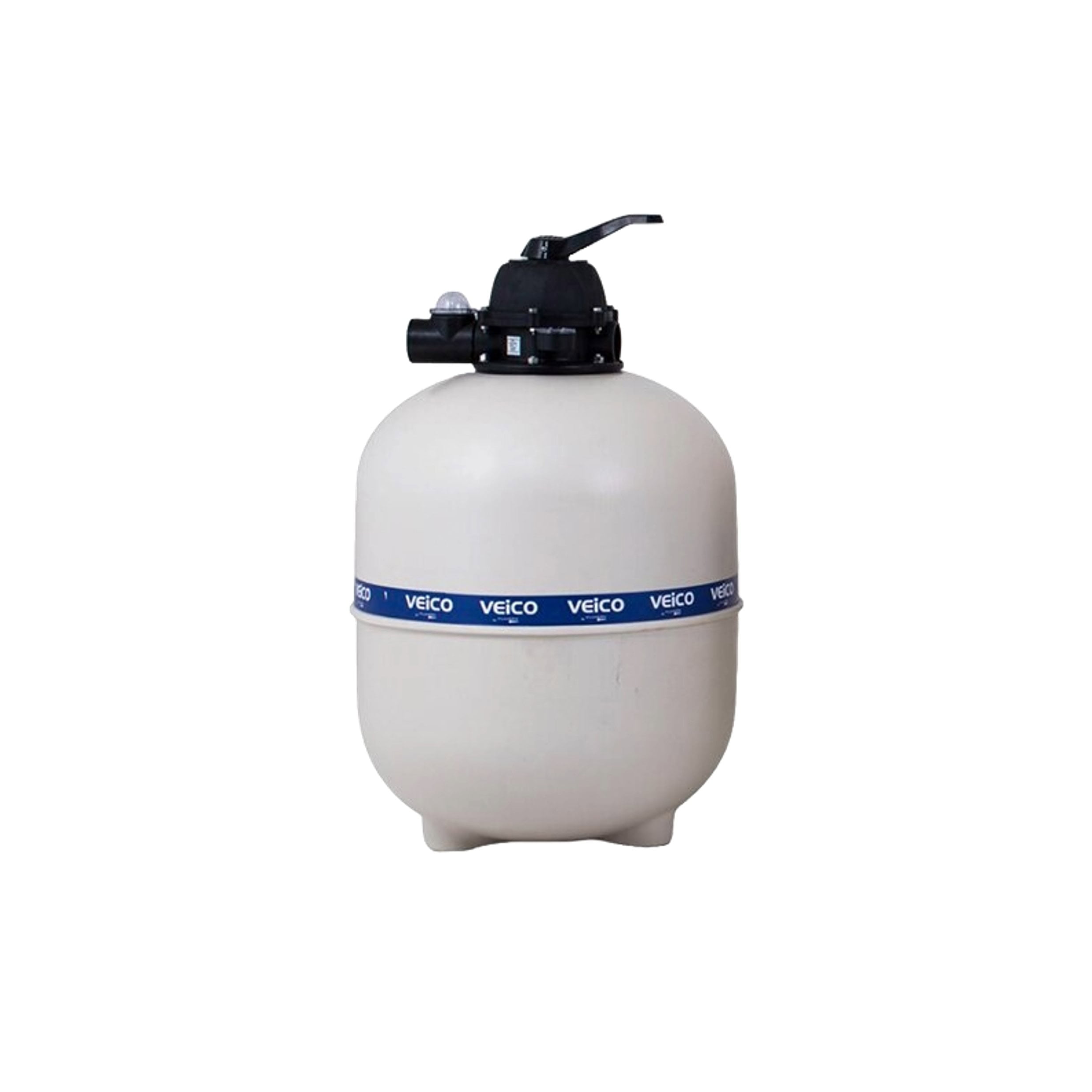 El Filtro Veico V-70 de polietileno rotomoldeado. Válvula selectora de seis funciones con conexiones de 50 mm y manómetro. Fabricado con plásticos de ingeniería (ABS, ABS + fibra de vidrio, policarbonato, EPDM) y elementos metálicos de acero inoxidable, garantiza un mayor rendimiento, robustez, facilidad de manejo y una mayor vida útil. La válvula se atornilla al tanque y cuenta con una junta de EPDM. Velocidad máxima de funcionamiento: 48 m³/h/m². Presión máxima de funcionamiento: 1,5 kg/cm².