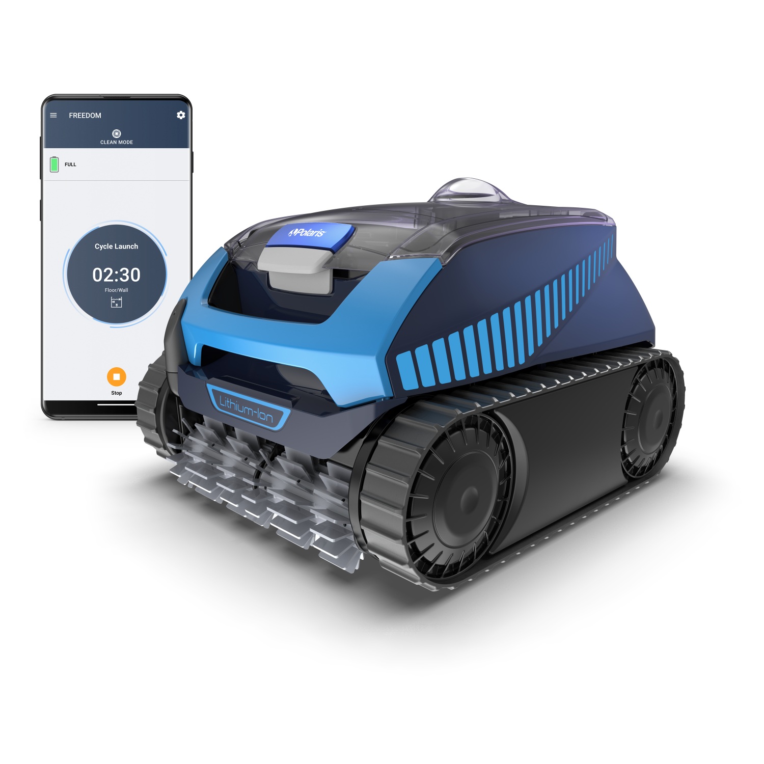 El Polaris FREEDOM proporciona una limpieza potente con cuatro modos de limpieza y envía notificaciones de aplicación cuando finaliza la limpieza para que pueda recuperar fácilmente el limpiador en la línea de flotación.