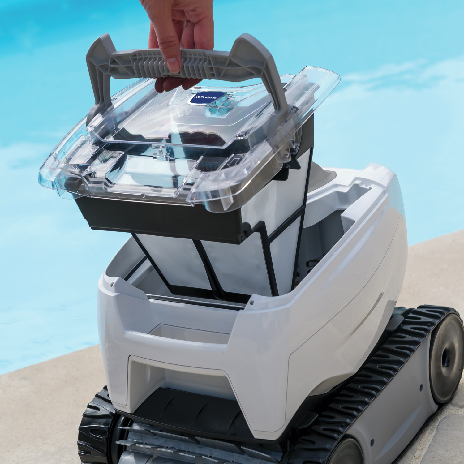 Sistema de elevación patentado que ayuda a sacar fácilmente el robot de la alberca, gracias a una rápida evacuación del agua.